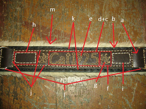 - Kunstfellpolster (FL), oder Polsterleder (PL) (nicht für Suithalsbänder geeignet), oder Filzpolster (FP) nach Auswahl